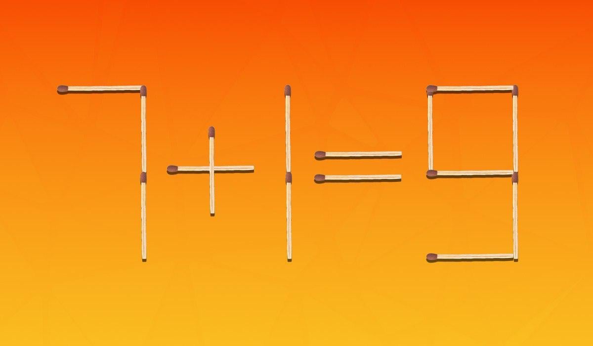 Az alábbiakban egy olyan képet láthatsz, ahol a 7+1=9 egyenlőséget gyufákkal rendezzük el. Nyilvánvaló, hogy ez matematikailag helytelen, és ezt úgy kell kijavítanod, hogy 15 gyufából csak két gyufát kell áthelyezned.