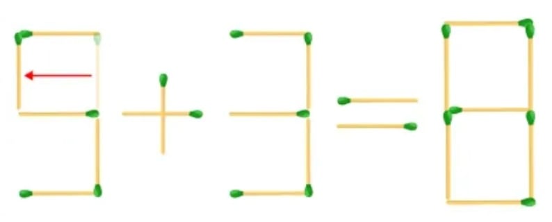 A titok a számok alakjának megváltoztatásában rejlik: csak egy gyufát kell úgy mozgatni, hogy az egyik „hármasból” „ötös” legyen. Ezután a példa teljesen helyes lesz – 5+3=8.