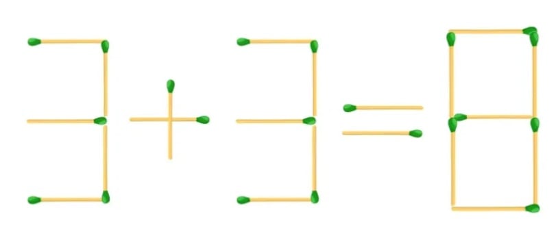A szemem előtt van egy gyufából készült hibás egyenlőség: 3+3=8. Szinte lehetetlennek tűnik kijavítani, ha nem lehet semmit sem eltávolítani vagy hozzáadni. Van azonban megoldás, és egyáltalán nem nyilvánvaló.