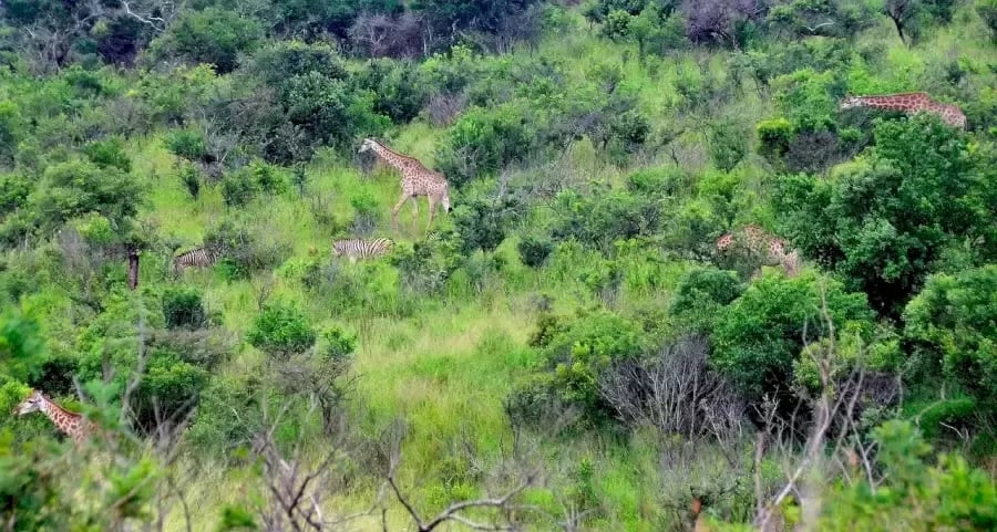 Egy csapat állatot látunk, akik zöld fák és bokrok között bolyonganak. Van a képen néhány zsiráf és zebra. De pontos számukat megszámolni nem könnyű feladat. Hiszen néhány állat jól látható, ugyanakkor néhányuk rejtve lehet a szemünk elől.